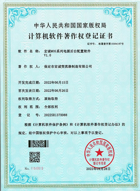 計(jì)算機(jī)軟件注冊(cè)權(quán)登記證書(shū)——整流電源開(kāi)放式測(cè)試平臺(tái)V1.0